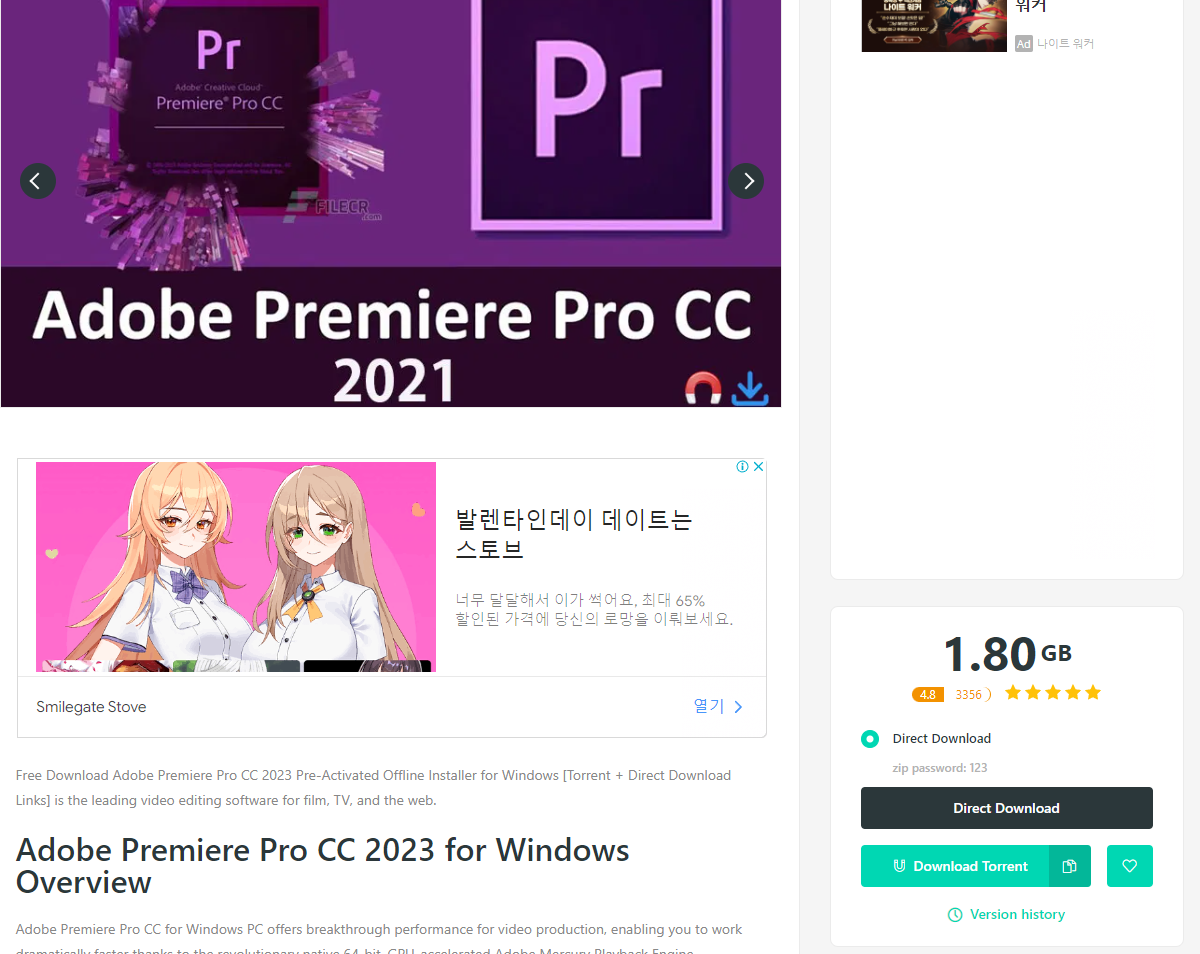 프리미어 프로 무료로 받은 사이트입니다. 밑에 다이렉트 다운로드를 누르시거나 또는 토렌트로도 다운로드 받을 수 있습니다. 크랙된 상태로 다운로드 할 수 있는데, 이게 문제점이 조금 시간이 지나면 어도비에서 막아서 삭제 후 재설치 하는 게 좋은 것 같았습니다. 돈이 있으신 분들은 직접 구매하셔서 이용하시길 바랍니다.